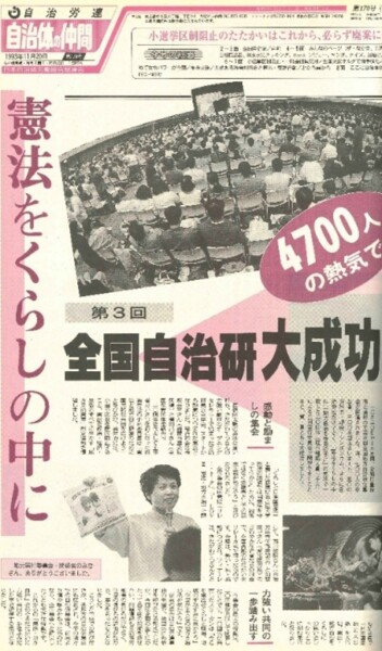 この発言は、自治体職員には大変なショックでした。「自分たちの仕事が、住民の願いに応えていないのでは?」「住民全体の奉仕者として、仕事を総点検してみる必要があるのでは?」との思いの中、自治体労働組合は、「自治体は住民の要求にどう応えているか」をテーマに、1957 年に山梨県甲府市で「第1回自治研全国集会」を開催しました。その後、1961 年の自治研集会ではスローガンも「地方自治を住民の手に」という実践課題的な内容に発展し、住民とともに自治体の民主化に向けて歩みはじめた全国の経験が報告されるようになっていきます。このスローガンは、「住民こそ地方自治の主人公」であることがうたわれたもので、今日の「自治研全国集会」へ引き継がれています。